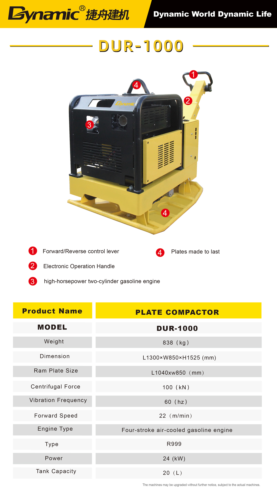 I takt med att byggbranschen fortsätter att utvecklas, med ett växande fokus på effektivitet, hållbarhet och säkerhet,DUR-1000Den kraftiga komprimatorn ligger i framkant inom innovation. Kombinationen av förtjockad pressplatta, kraftfullt vibrationssystem, pålitlig motor och användarcentrerad design gör den till ett oumbärligt verktyg för moderna byggprojekt. Oavsett om den används vid vägbyggnation, bygggrunder eller miljöprojekt,DUR-1000levererar konsekventa, högkvalitativa komprimeringsresultat, vilket hjälper byggproffs att uppnå sina mål effektivt och kostnadseffektivt.